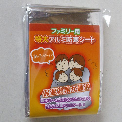 親子3〜4人が入ることのできる特大の防寒ブランケット。水にも強く、破れにくく災害時の防寒用にファミリーで一枚あれば安心です。 サイズ:150×300cm |